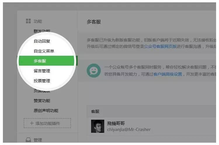 在7月1日后仍未手动升级的旧版多客服的用户,公众平台将自动为其升级到新版网页功能,旧版多客服将失效。自动升级的用户,需要登录微信公众平台,在“功能 - 客服功能”页面中,为客服帐号绑定对应的客服人员微信号,绑定后才可使用网页版客服功能进行客服服务。