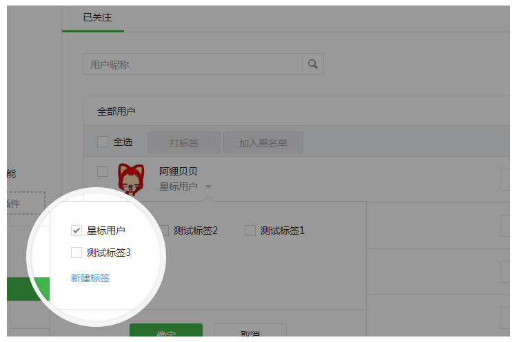 运营者可登录公众平台后台,点击左侧菜单“用户管理”后管理已关注用户,点击其中一个用户右侧的“标签”小角标可弹出复选框快速为该用户添加标签,且添加标签复选框内已支持直接新建标签。