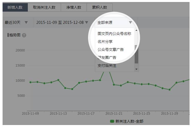 2、细化新增订阅用户来源,增加图文页内公众号名称、扫描二维码、公众号文章广告、朋友圈广告、支付后关注来源。