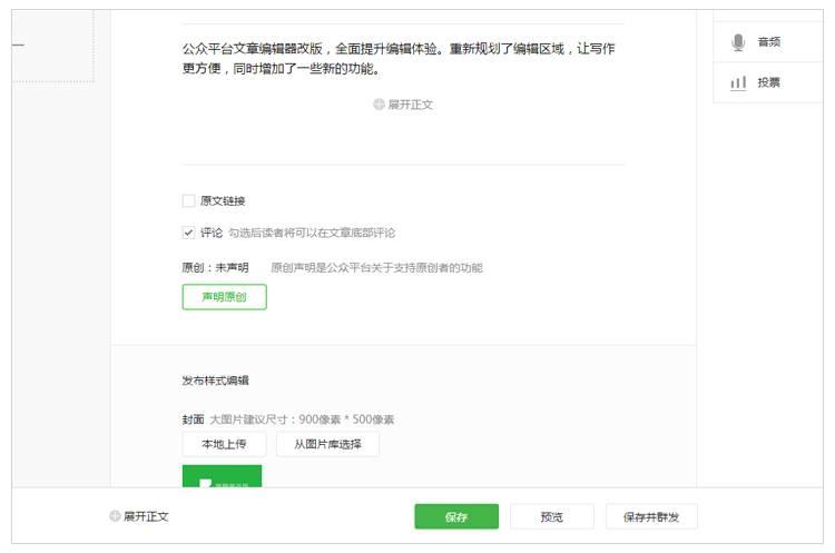 2、优化长文章编辑体验。新增收起/展开正文功能,帮你快速地检查文章相关设置。