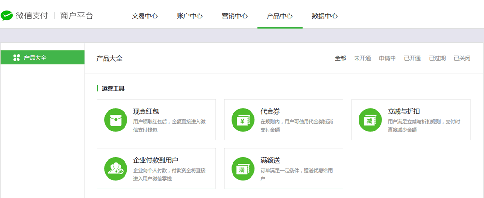为实现商户平台产品的统一展示和管理、优化产品使用体验,微信支付上线了产品中心功能。产品中心可以帮助你实现以下目的: