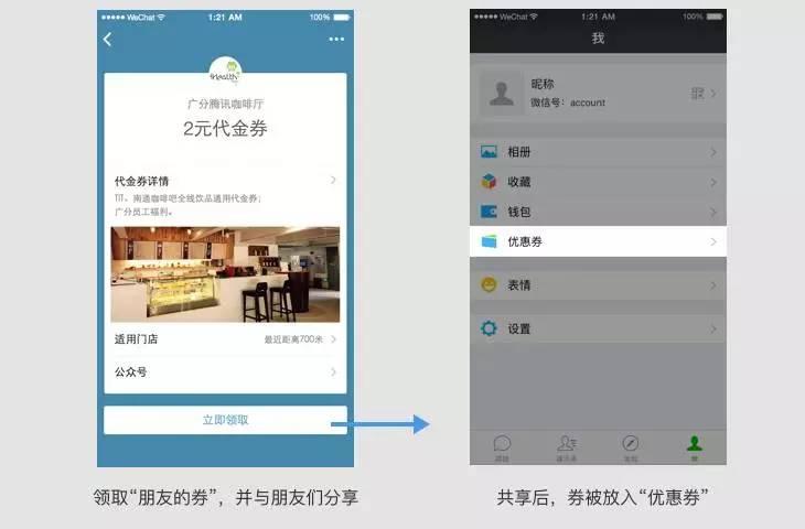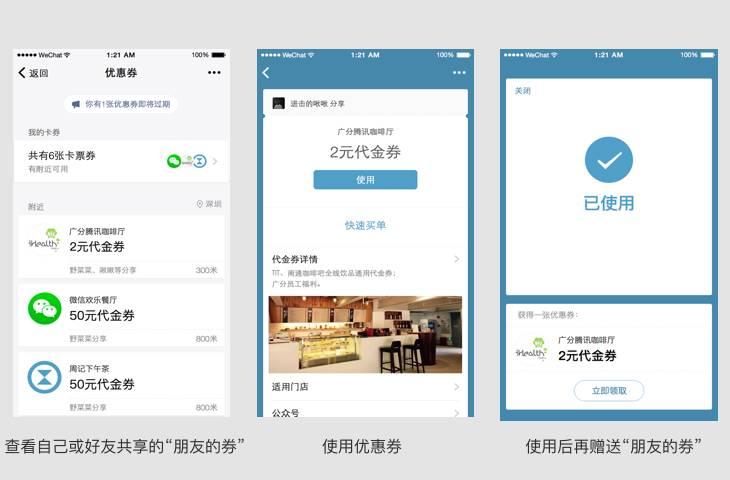 微信推出优惠券新玩法——朋友共享的优惠券(以下简称“朋友的券”),实现“一人领取多人共享”,加速社交传播,提高转化率。